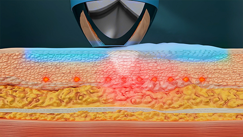 표피를 쿨링하는 한편, HIFU (High Intensity Focused Ultrasound)를 피부 표면 아래 1.5, 3.0, 4.5mm 깊이에 조사하여 해당 부위에 집속된 열응고점이 발생하면서